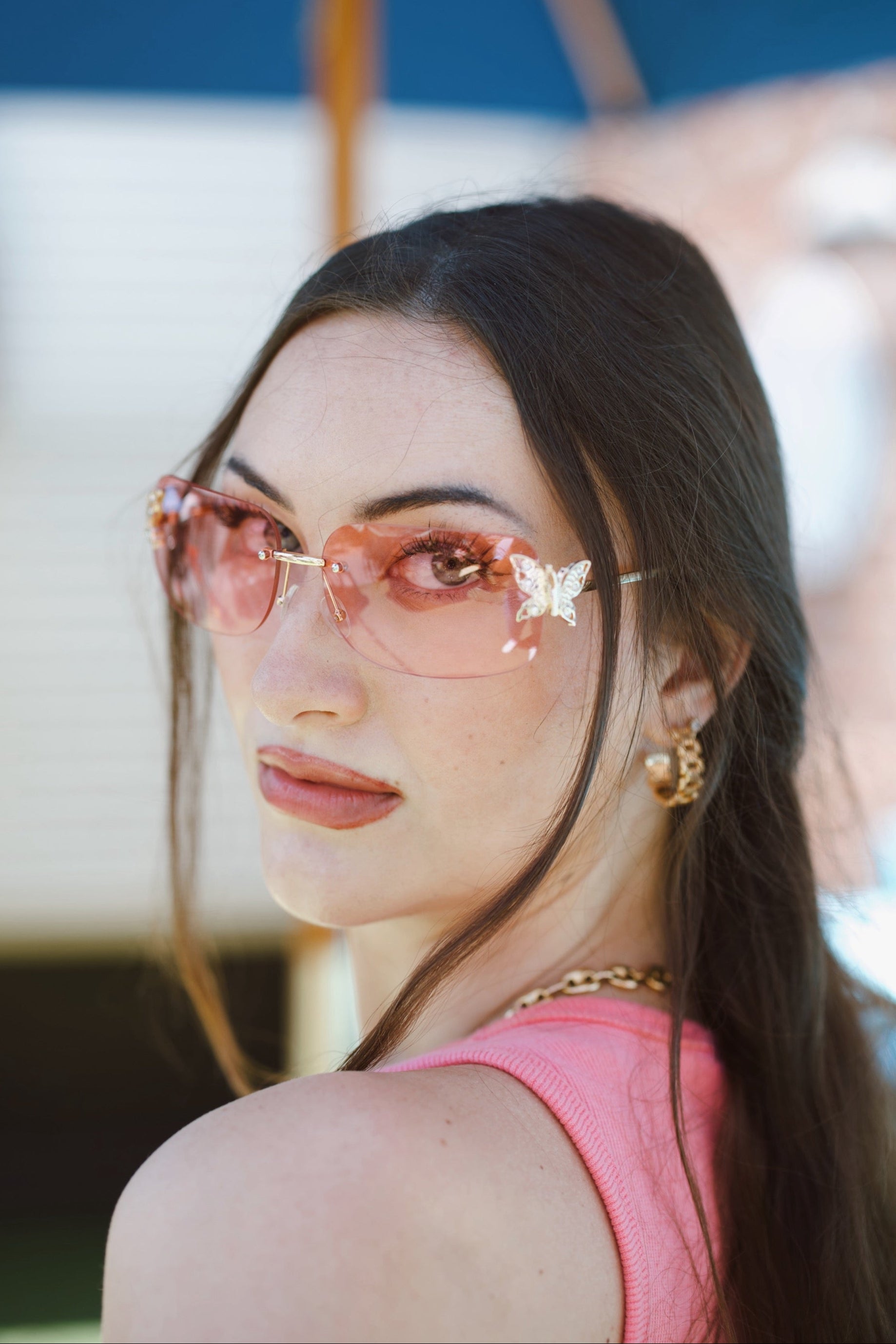 Y2K-inspired and bold, BLOOMWINGS features a square frame crafted from polycarbonate and copper, adorned with a striking gold butterfly detail. These sunglasses provide full UV protection while adding a playful, standout accent to your look. Perfect for making a statement with retro-meets-modern style.