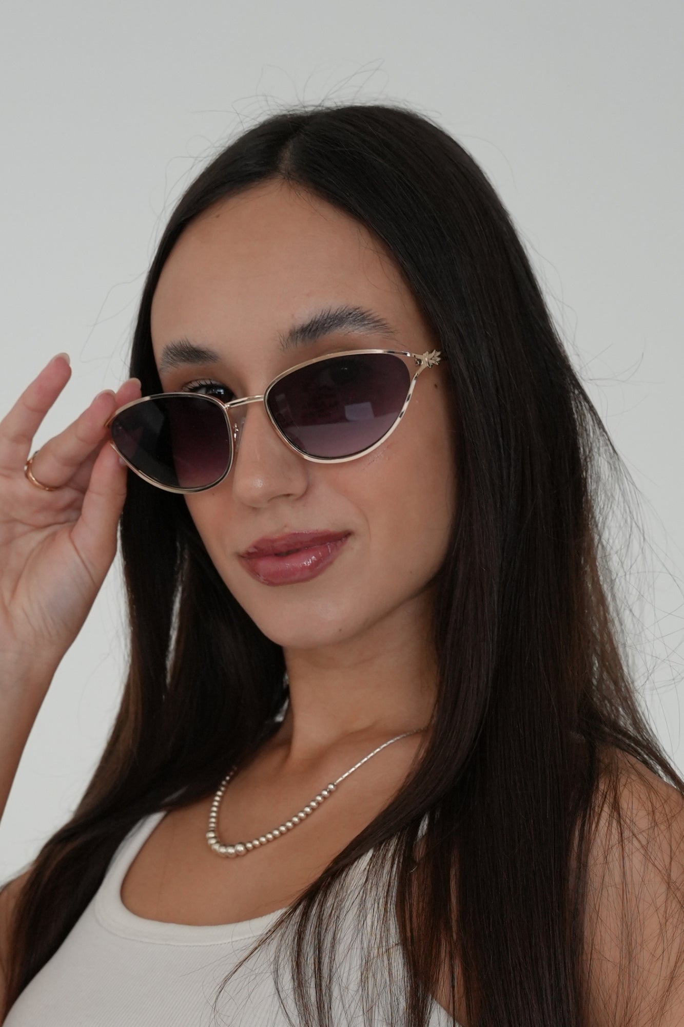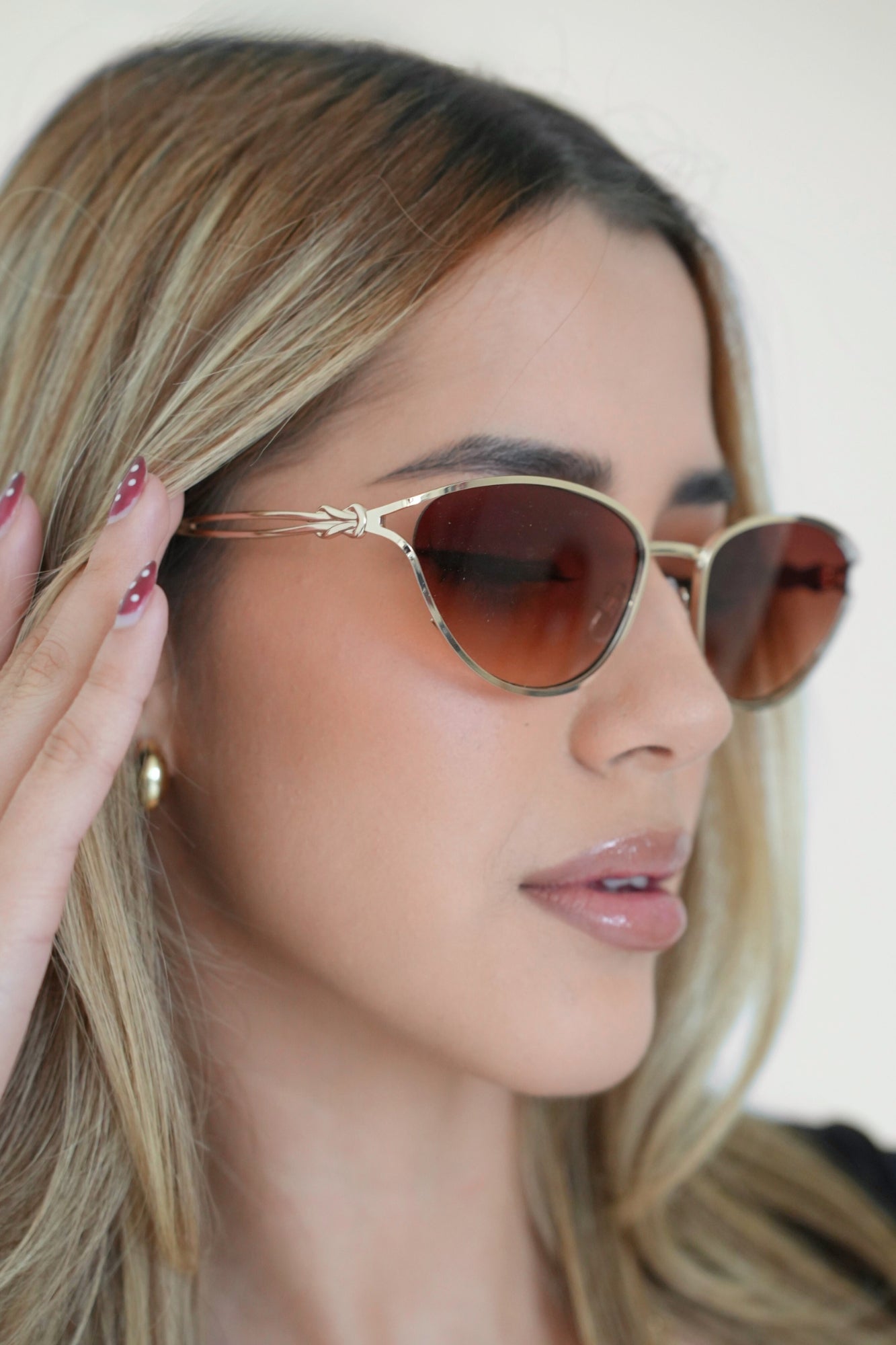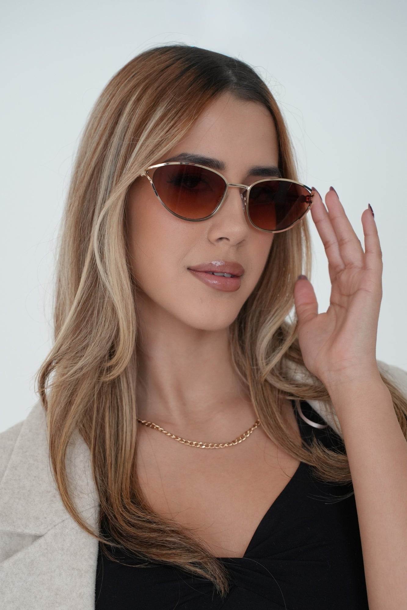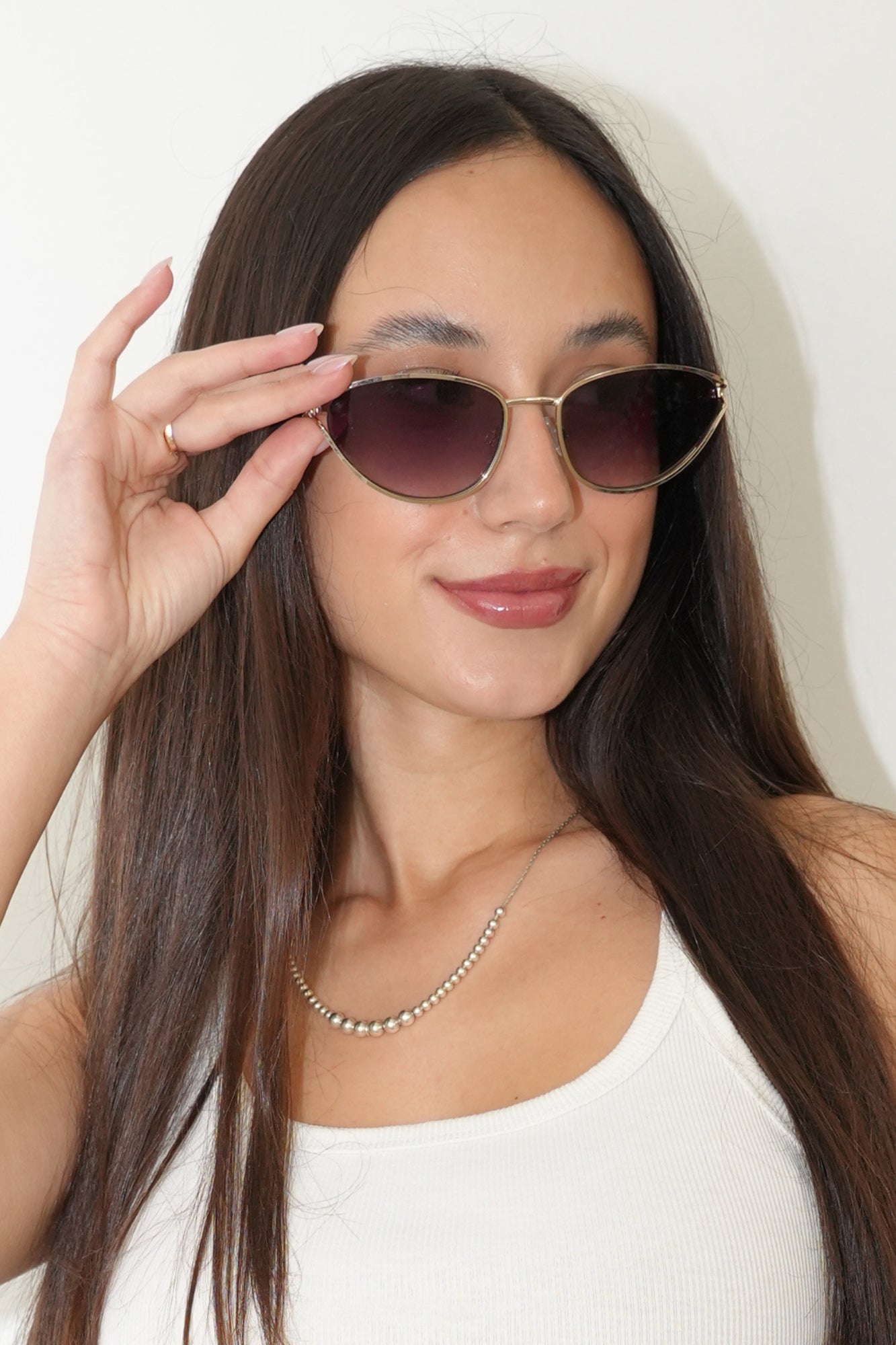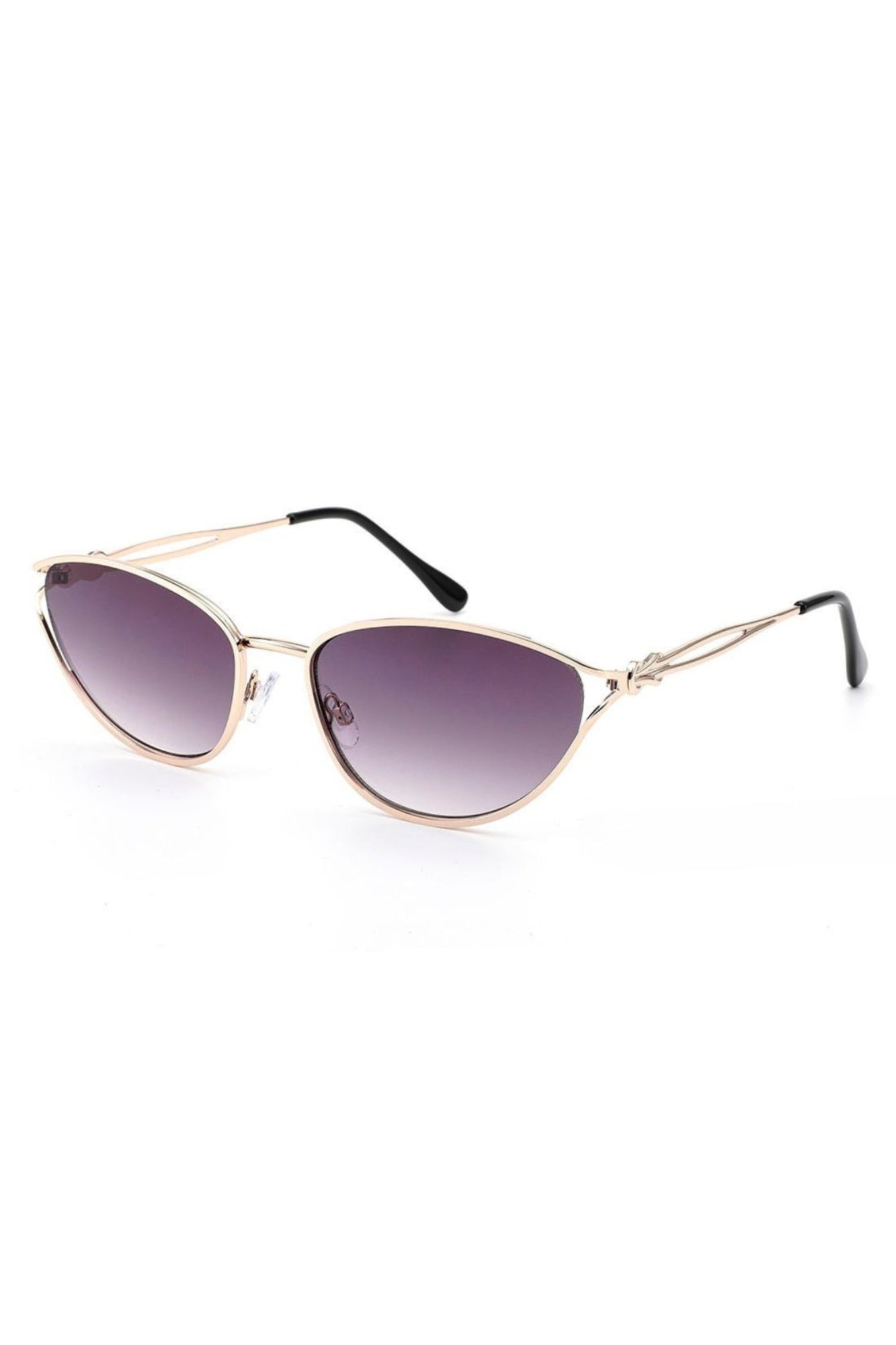 Feature a cat-eye inspired silhouette with a thin polished gold metal frame that gives them a refined, high-end look. The lenses are brown and smoke gradient, adding softness and dimension to the style. The temples have a unique twisted gold metal detail, creating a delicate, decorative touch that elevates the overall design. The frame sits lightly on the face, giving a chic and modern feel while maintaining a timeless elegance.